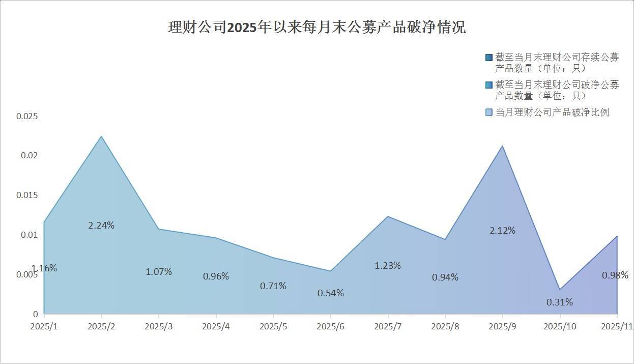 破净情况:南财理财通数据显示,截至11月末,32家理财公司共计存续27999只公募理财产品,其中275只产品累计净值低于1,破净比例增长至0.98%。
