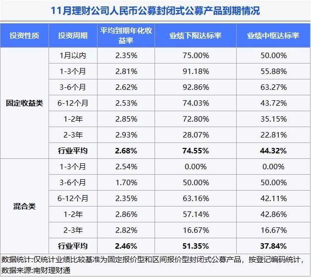 到期情况:2025年11月,32家理财公司合计有904只(按登记编码核算)封闭式人民币理财产品到期。达标率方面,到期产品业绩下限达标率为73.22%,业绩中枢达标率为43.86%。从到期产品业绩水平看,固定收益类封闭式人民币公募产品年化收益率均值为2.68%,混合类产品为2.46%。