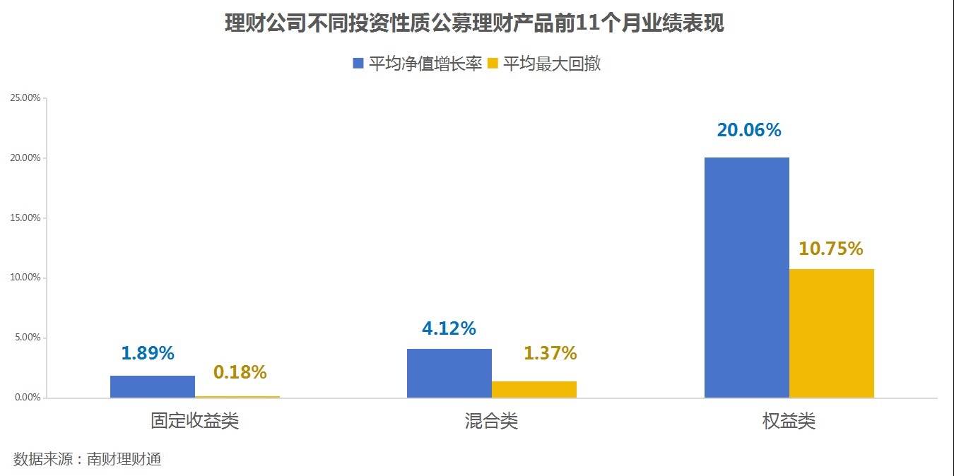 产品收益:截至2025年11月,权益类投资表现最为突出,其平均净值增长率达到20.06%,收益增长幅度最大,但同时风险也较高,最大回撤突破10%。混合类产品净值增长率居中,为4.12%,最大回撤1.37%。固收产品收益最低,仅1.89%,不过最大回撤也最小,为0.18%,风险较低。