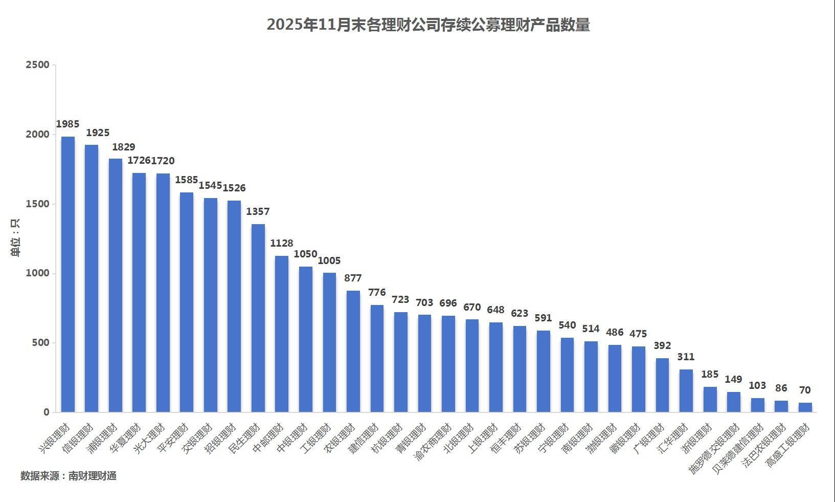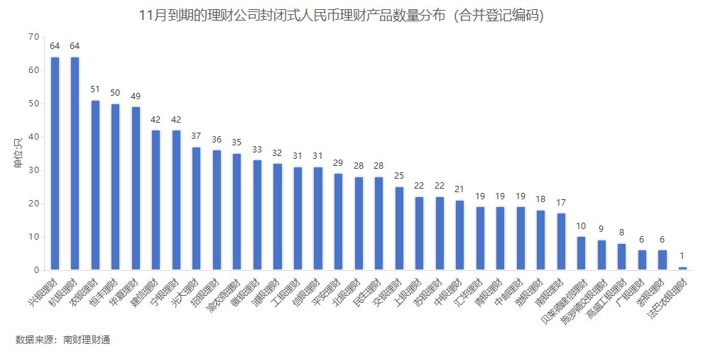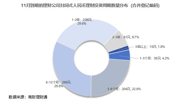 产品数量:据南财理财通数据,2025年11月,32家理财公司合计有904只(按登记编码核算)封闭式人民币理财产品到期。分投资性质看,固收类、混合类、权益类分别有857只、41只、5只产品到期,商品及金融衍生品类理财有1只到期。分募集方式看,公募型产品数量753只,私募型产品151只。兴银理财、杭银理财、农银理财到期产品数量位居前三。