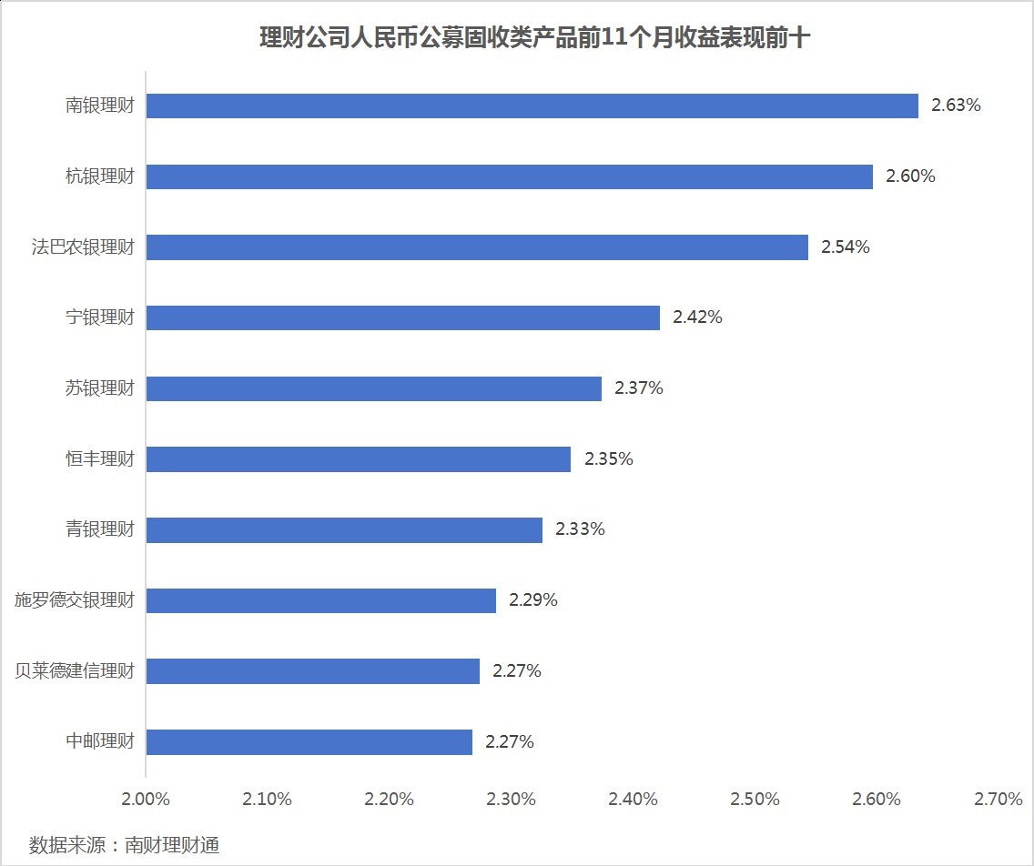 具体到人民币公募固收类产品收益表现方面,南银理财、杭银理财以及法巴农银理财今年前11个月的收益表现最好,平均净值增长率均超过2.5%,分别为2.63%、2.60%和2.54%。