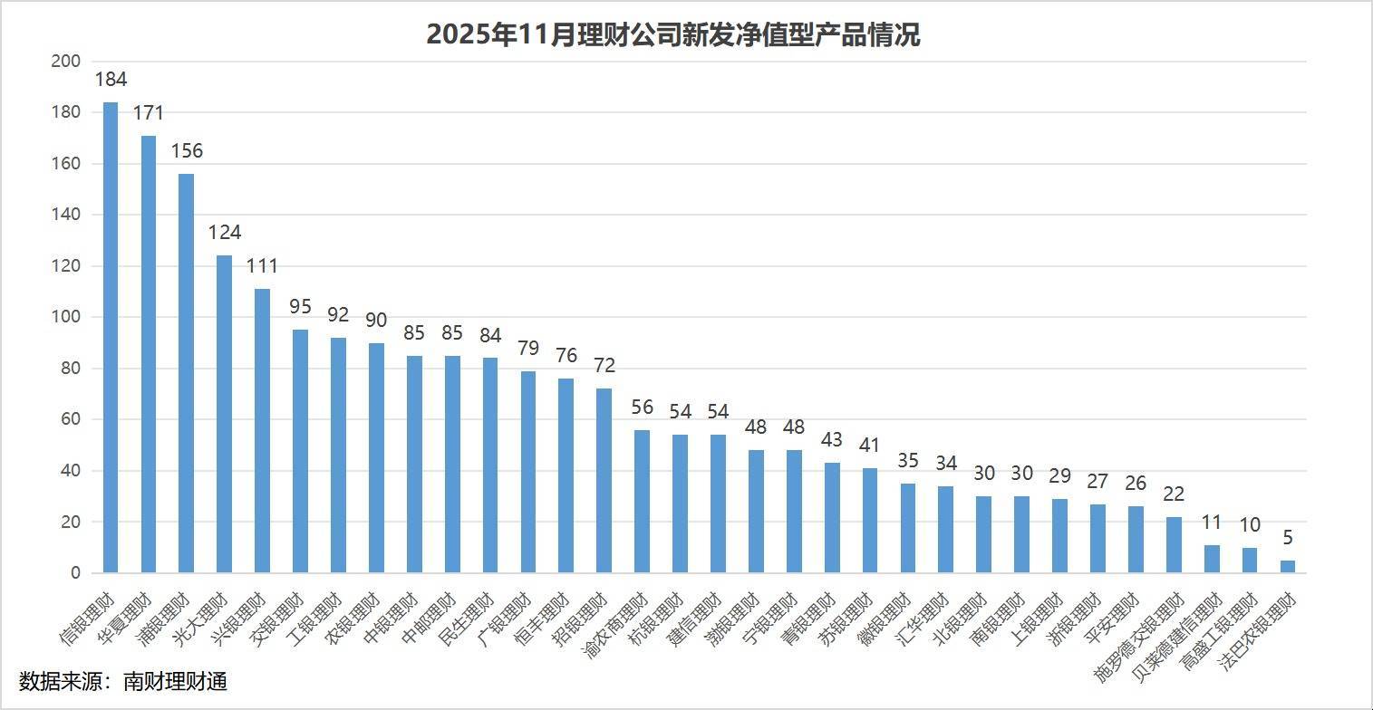 产品数量:南财理财通数据显示,2025年11月,32家理财公司合计发行了2107只理财产品(同一产品登记编码下不同份额合并计算),环比10月份的1642只增长了28.32%。发行数量位居前三的理财公司分别为信银理财、华夏理财和浦银理财,发行数量分别为184只、171只和156只。