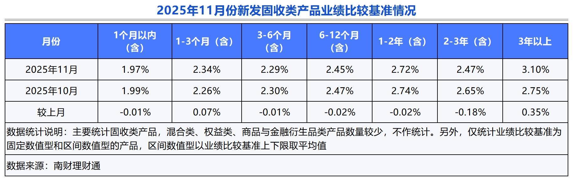 到期业绩:从11月到期产品的业绩水平看,固定收益类封闭式人民币公募产品年化收益率均值为2.68%,混合类产品为2.46%。