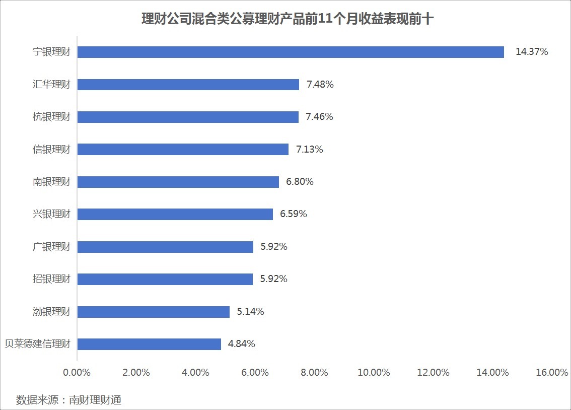 混合类理财产品表现上,宁银理财、汇华理财以及杭银理财依旧位列前三。宁银理财今年前11个月平均净值增长率达到14.37%;汇华理财收益小幅超越杭银理财,平均净值增长率分别为7.48%、7.46%。